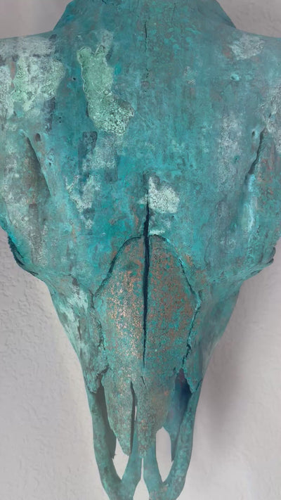 This real, large male Buffalo skull is hand gilded in genuine copper leaf. Once the copper surface is set, a controlled oxidizing agent is applied, reacting with the metal to initiate the patination process. This chemical transformation allows the copper to naturally evolve in color and texture, creating layered tones, depth, and organic variation that cannot be replicated or rushed.